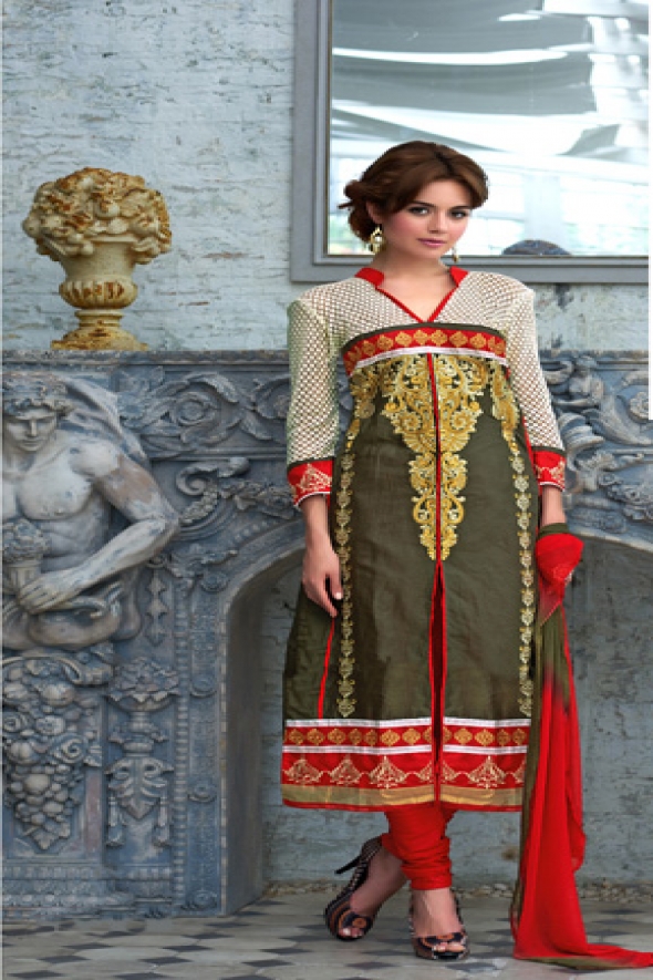 Top Fabric :- satin cotton (cut:-2 mtr), Sleev Fabric- fancy net (cut:-.50 mtr), Bottom Fabric:- cotton (cut:-2.40 mtr), Duppta Fabric:- Naznin chiffon (cut:-2.25 mtr), Length:- 48+, Color :- Coffee, Type :- Unstich, Estimated Delivery Time : 6-8 working days