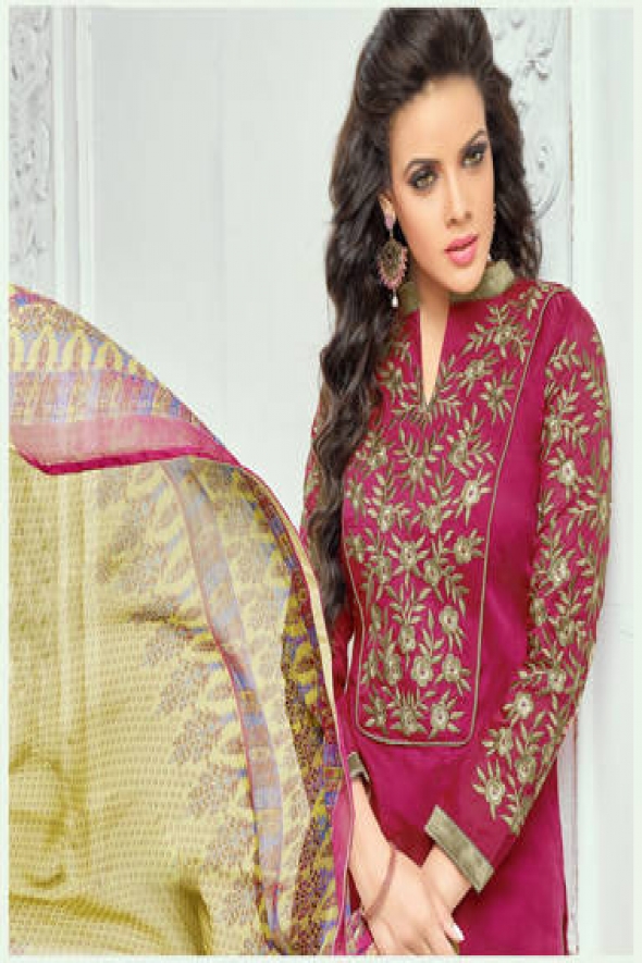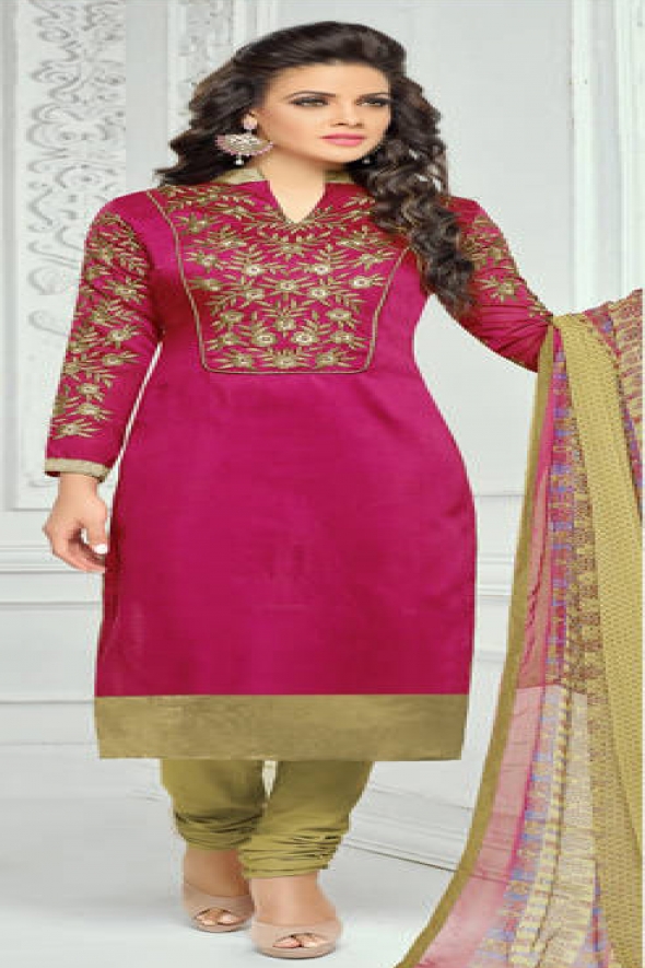 Top Fabric :- cotton chanderi (cut:-2.10 mtr), Sleev Fabric- cotton chanderi (cut:-.50 mtr), Bottom Fabric:- cotton (cut:-2.20 mtr), Duppta Fabric:- naznin mil print (cut:-2.20 mtr), Length:- 48+, Color :- Dark Rani, Type :- Unstich, Estimated Delivery Time : 6-8 working days