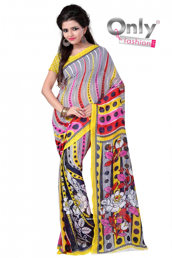 SAREE-5.25 MTR, BLOUSE-0.75 MTR, Top Fabric :- FAUX GEORGETTE, Bottom Fabric :- FAUX GEORGETTE, Color :- Yellow, Type :- Printed, Estimated Delivery Time : 6-8 working days